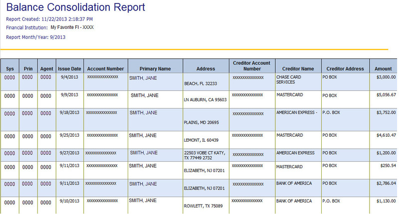 This is a monthly report used to view accounts and lender information for which balance consolidation checks were issued.