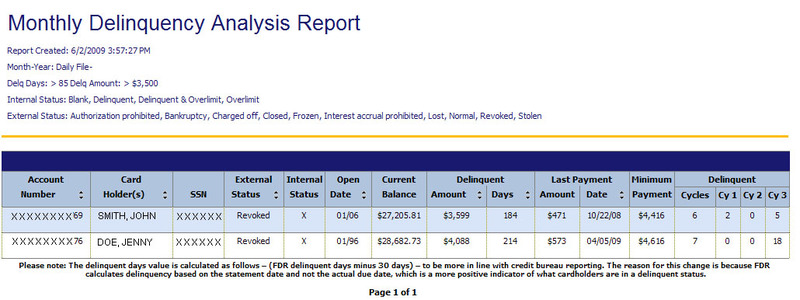 Note: The Delinquent Days value is calculated as follows - (Optis system delinquent days minus 30 days) - to be more in line with credit bureau reporting. The reason for this change is because the Optis system calculates delinquency based on the statement date and not the actual due date, which is a more positive indicator of what cardholders are in a delinquent status.