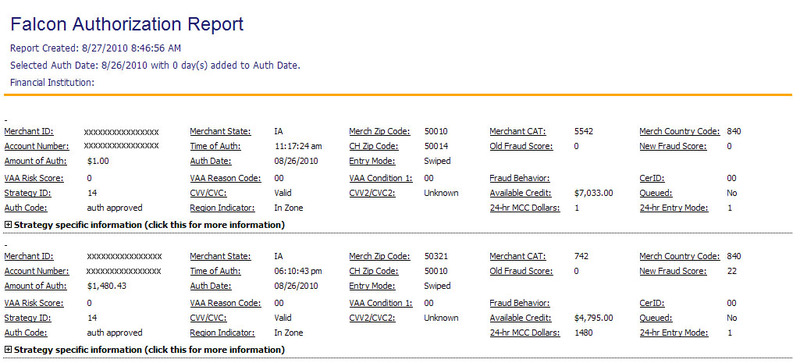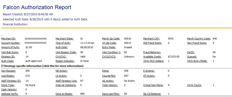 This report displays Falcon and VAA specific information. This report is used to research transactions that have been declined, identify fraud trends and is the only place where the VAA strategy is displayed.