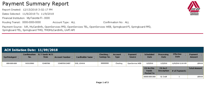 The Payment Summary Report is a daily report. Use this report to view payments made through the Springboard Make Payment link, IVR, and MyCardInfo website.