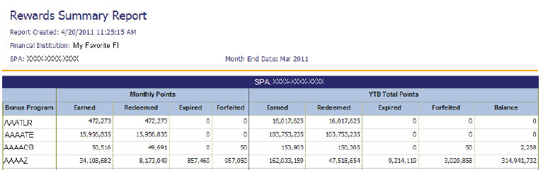 This is a monthly report that allows the user to view points earned, redeemed, expired, and forfeited by program and SPA.
